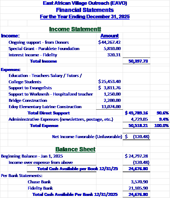 2. Financial Statements (How We Spent Your Gifts): We are pleased to inform you that in the year 2024, EAVO received roughly $77,000 in donations. Less than 5% of that has been spent on Admin cost such as printing newsletters, postage and other miscellaneous items. No other overhead expenses, thus 95% of your gift goes to the beneficiaries.
