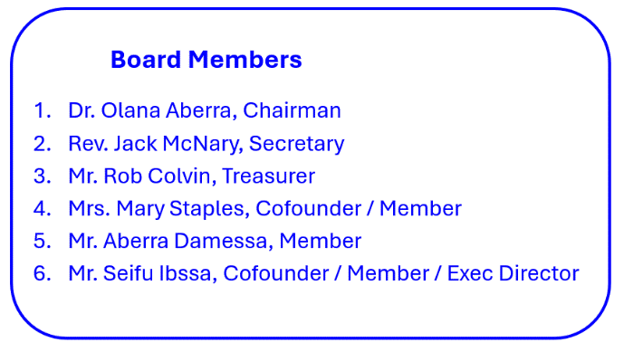 Dr. Olana Aberra, MD (Chairman), Jim Reese (Member), Skip Ohs (Treasurer), Adele Ohs (Secretary), Mary Staples (Member), Jaime Major (Member), Aberra Damessa (Member), Seifu Ibssa (Member and Executive Director).